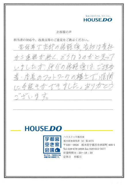 この度はハウスドゥ宇都宮南にお任せいただき、ありがとうございました。 初めはご心配をおかけし、申し訳ございませんでした。 その後の対応にご評価いただき、ありがとうございます。