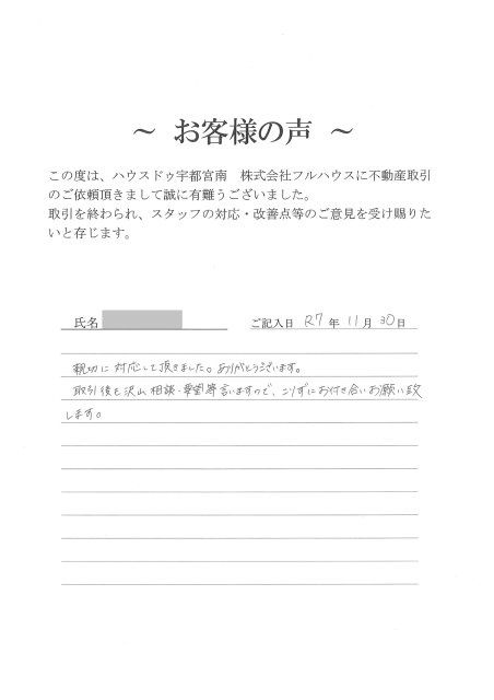 この度はハウスドゥ宇都宮南にお任せいただき、ありがとうございました。 引き続きサポートさせていただきますので、お気軽にお問い合わせください。